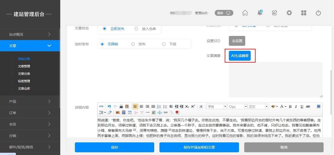 一、AI提取文章摘要(建站全版本)使用场景:使用AI快速提取文摘摘要,提高效率提示:必须要先填写文章详情内容,才能使用AI提取摘要功能,AI使用次数是根据免费的额度来定,超过需要单独购买后台:添加文章—AI生成摘要二、AI提取SEOTKD功能(建站全版本)使用场景:使用AI智能提取SEO关键词和描述提示:必须要先填写文章详情内容,才能使用AI提取SEO功能,AI使用次数是根据免费的额度来定,超过需要单独购买后台:添加文章—SEO设置—AI自动提取三、AI批量翻译文章功能(基础版、标准版、营销版)